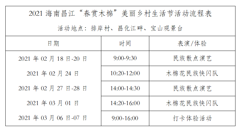 另一重點線下活動——“花開黎鄉·唱響春天”賞花放歌昌江行將于2月24日舉行,屆時將有顧莉雅、何奕、阿儂子黎等民族歌手唱游昌江,在木棉梯田、昌化江畔、寶山觀景臺等地留下美好動聽的歌聲。